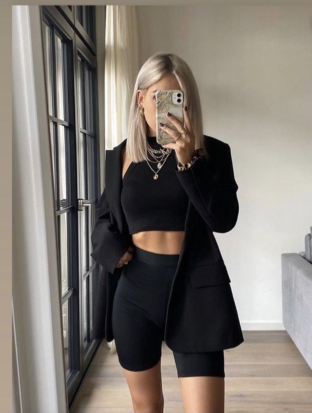 Podrías armar todo un outfit negro con un pantalón y una blusa totalmente negras junto con una bolsa o quizá un collar y uñas color rosas.
